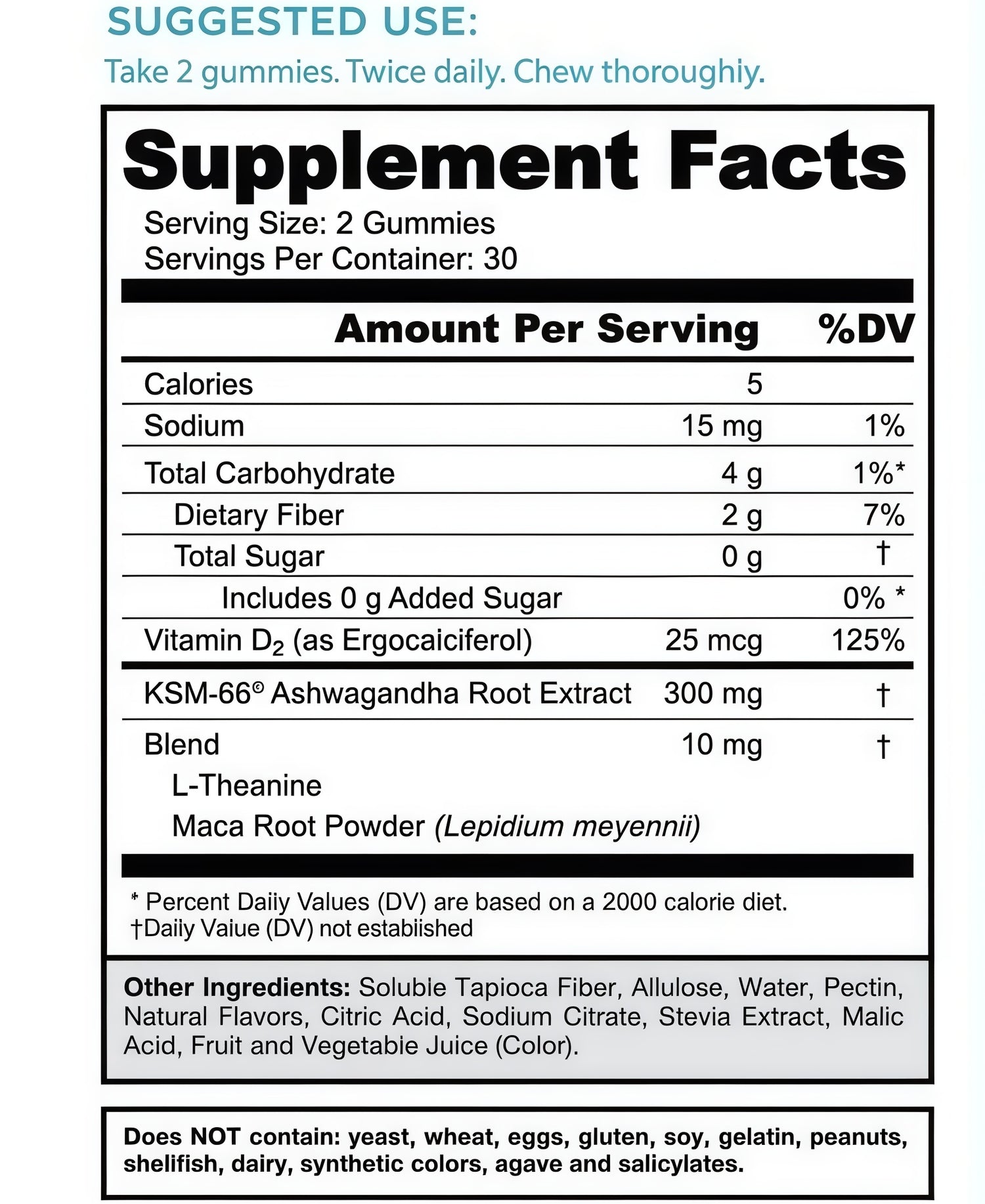 Made with clinically studied KSM-66® Ashwagandha, L-Theanine, and Maca to help reduce stress, support sleep quality, and enhance focus — all in a delicious zero sugar gummy you’ll enjoy adding to your routine.