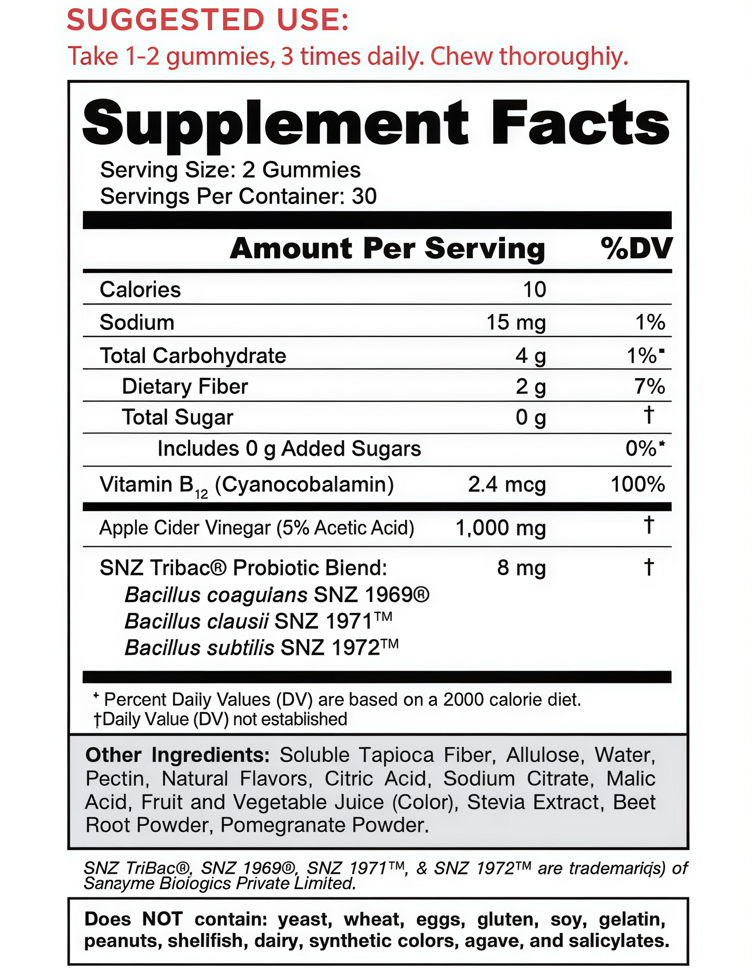 Our flagship formula, now with zero sugar. Includes Apple Cider Vinegar, Vitamin B12, and SNZ Tribac® probiotics to help support digestion, reduce occasional bloating, and promote energy metabolism, immune function, and overall wellness.