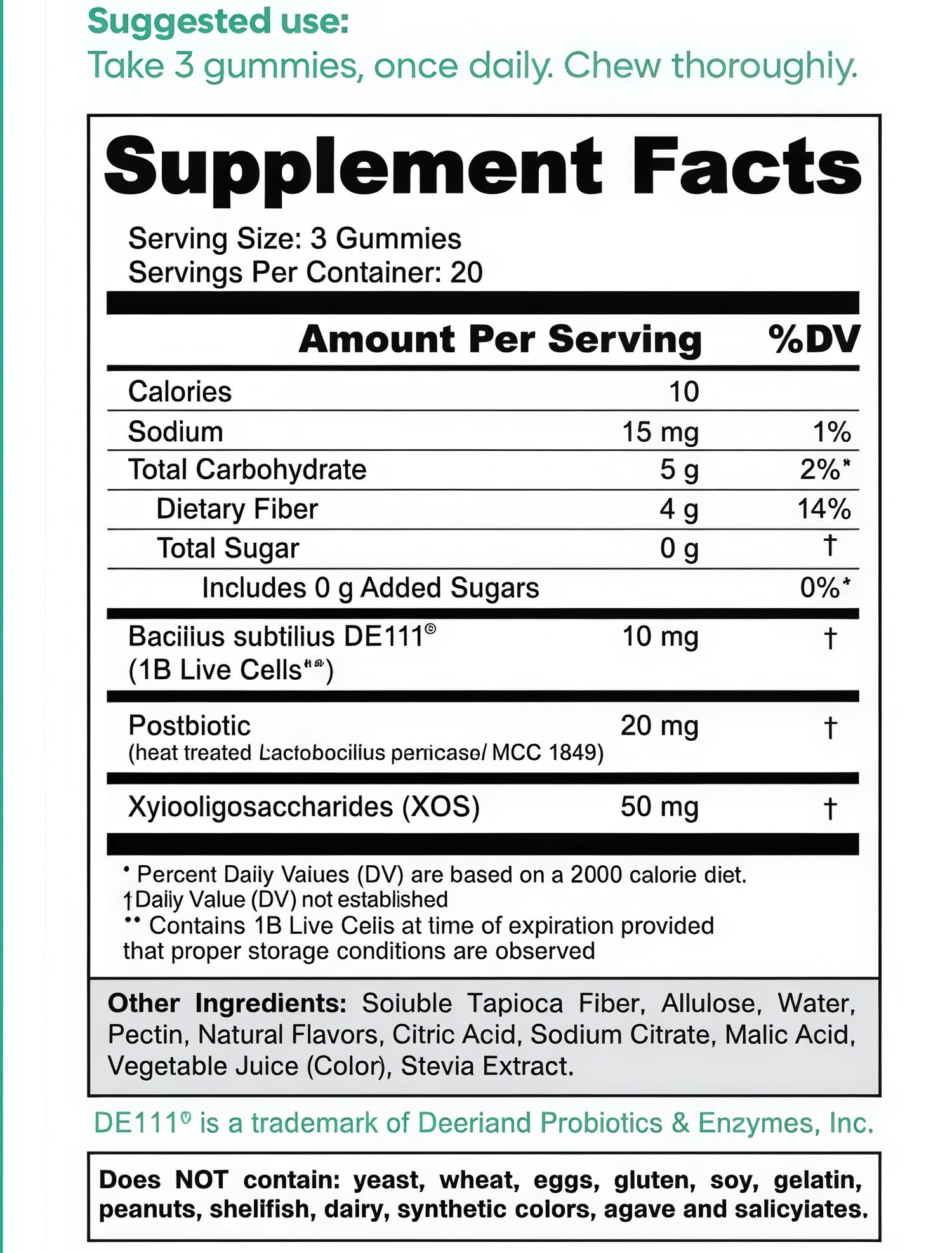 The world’s first 3-in-1 gummy with prebiotics (XOS), probiotics (DE111®), and postbiotics (MCC1849) — all in a zero sugar format. Helps support digestion, gut flora balance, immune health, and daily digestive well-being.
